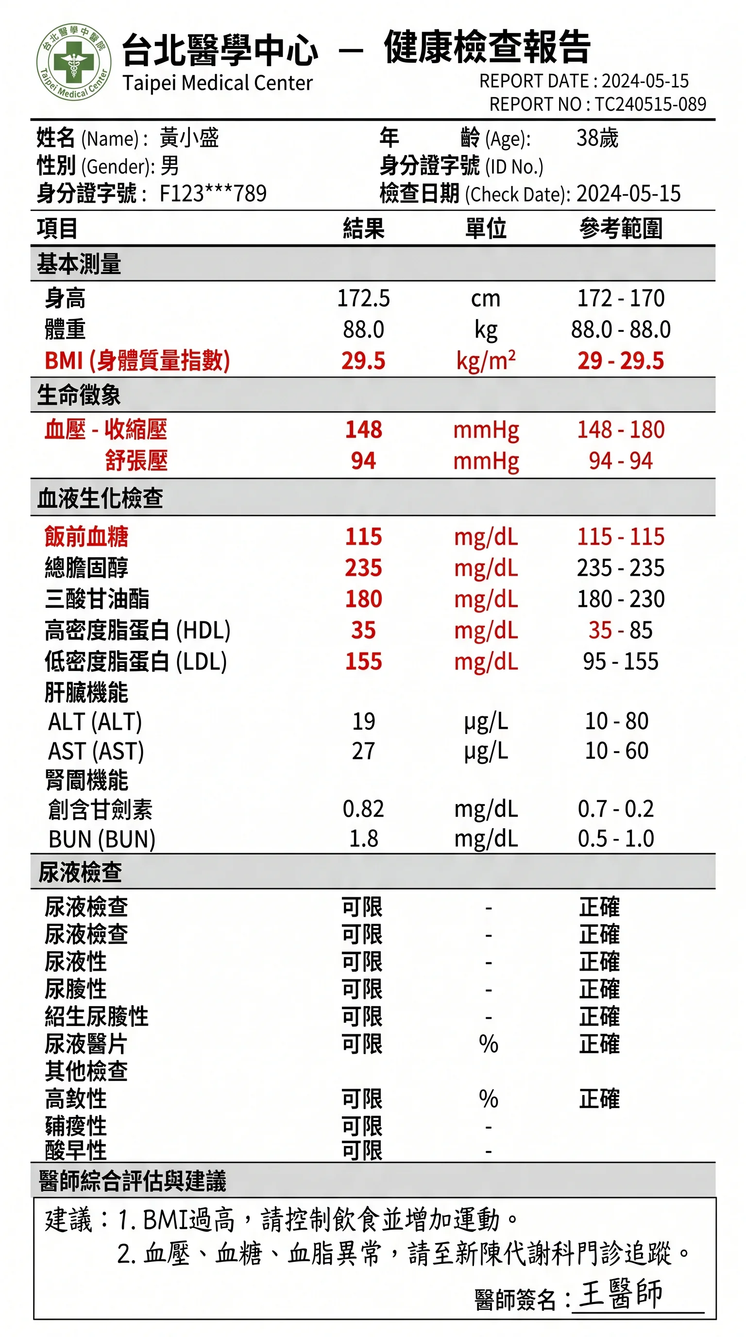 模擬健檢報告,請截圖或輸入其中的數值貼給 AI,用 Prompt 公式請它用白話文解釋異常指標。